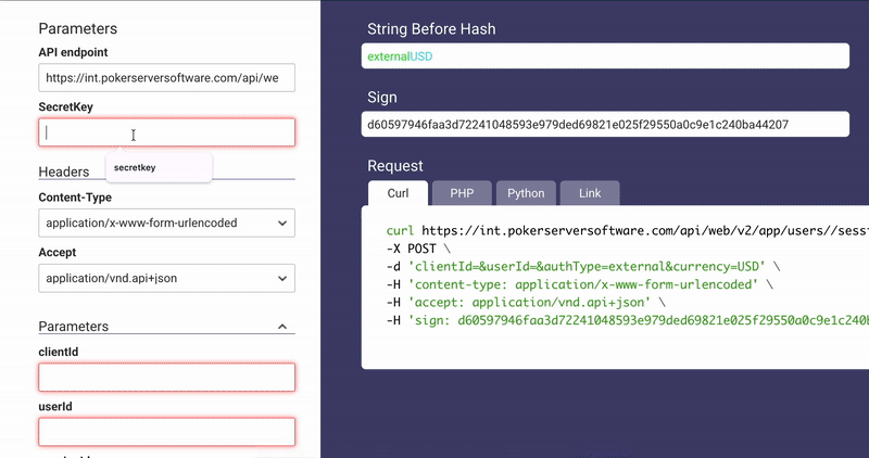 sign | A sha256 hash required for most API calls to ensure request integrity. The signature is generated from ALL parameters (query, path, and form/body) except for a set of excluded parameters and clientId , which must be removed before signing. |